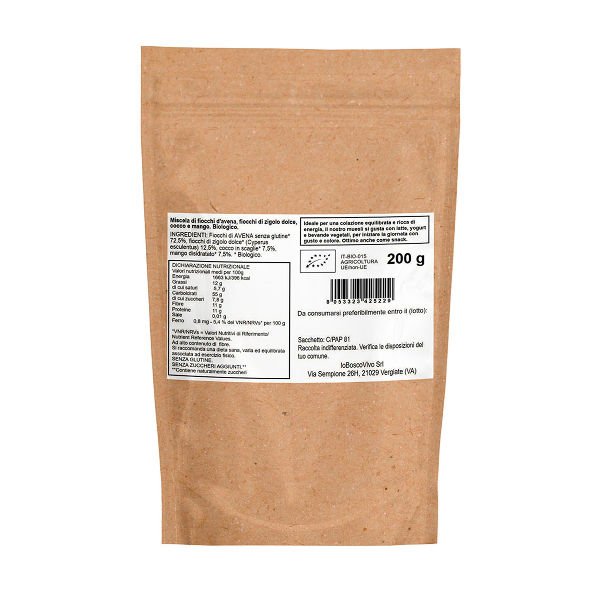 Fiocchi di avena*, Fiocchi di Chufa*, Mango disidratato* e cocco a scaglie*. *Ingredienti BIO